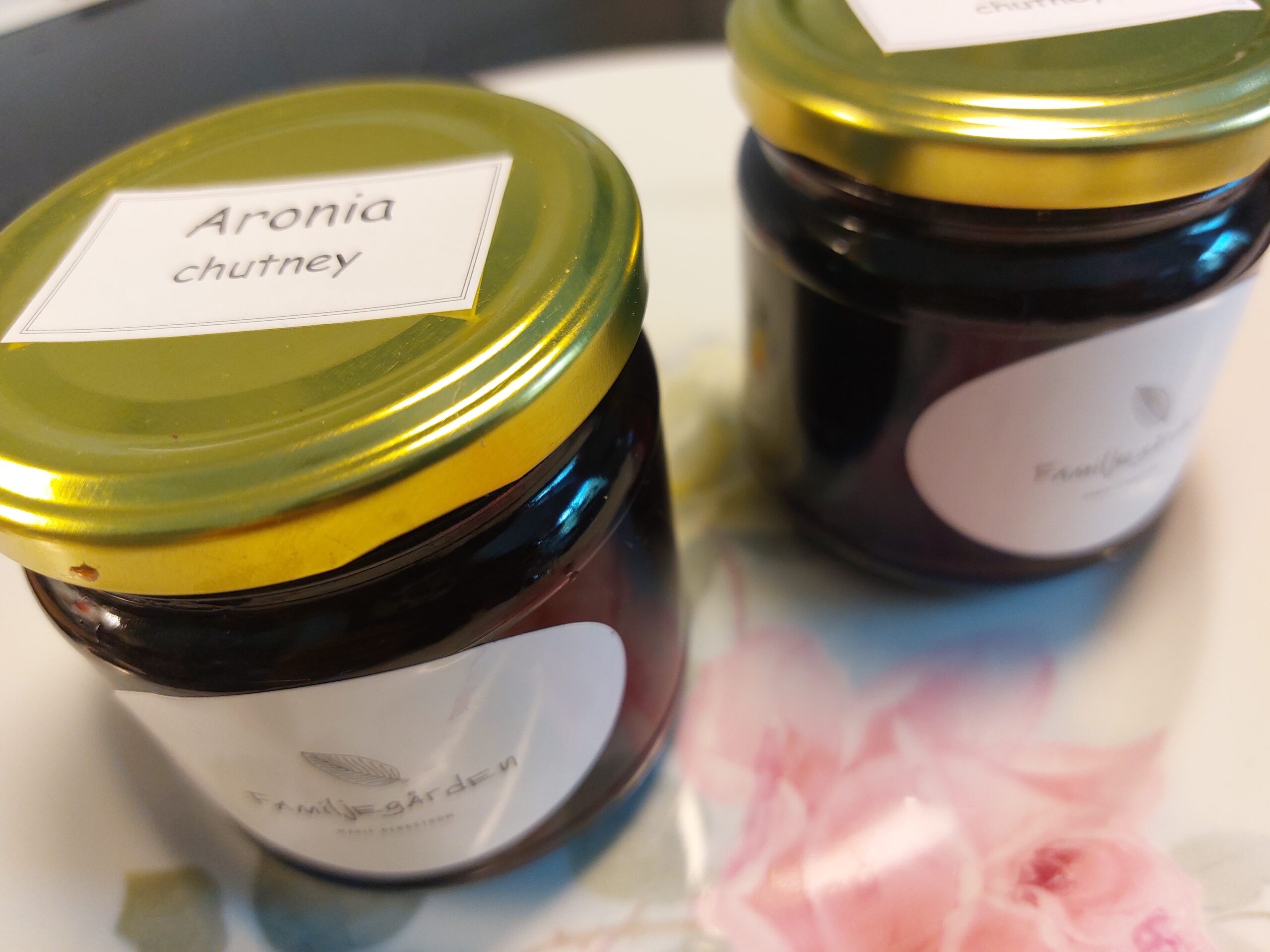 Härlig chutney med aroniabär som bas. Övriga ingredienser är lök vitlök chili äpple äppelcidervinäger syltsocker salt kanel kardemumma senapsfrö och Garam Masala