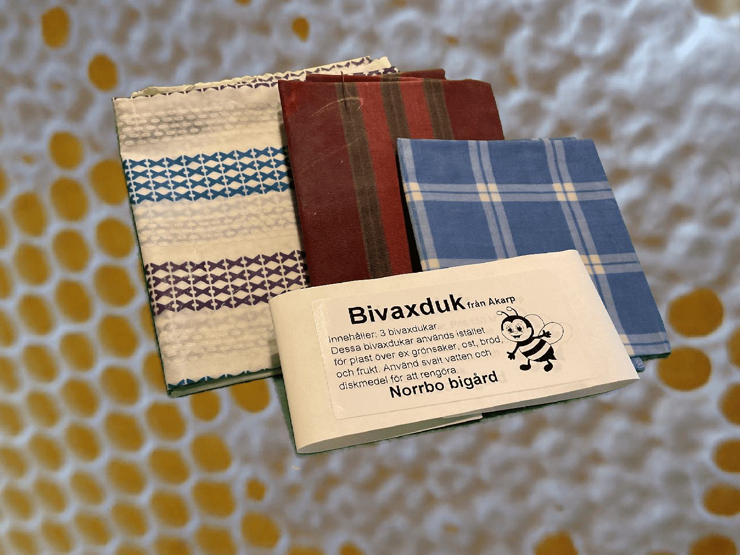 Bivaxdukarna är gjorda av bomullstyg och vaxet är från våra bins egna vaxkakor. Varje förpackning innehåller 3 st vaxdukar i olika storlekar. Man använder dem i stället för plast t ex runt grönsaker, ost eller runt skålar med mat. Man ren gör de lättast med svaltvatten och diskborste.