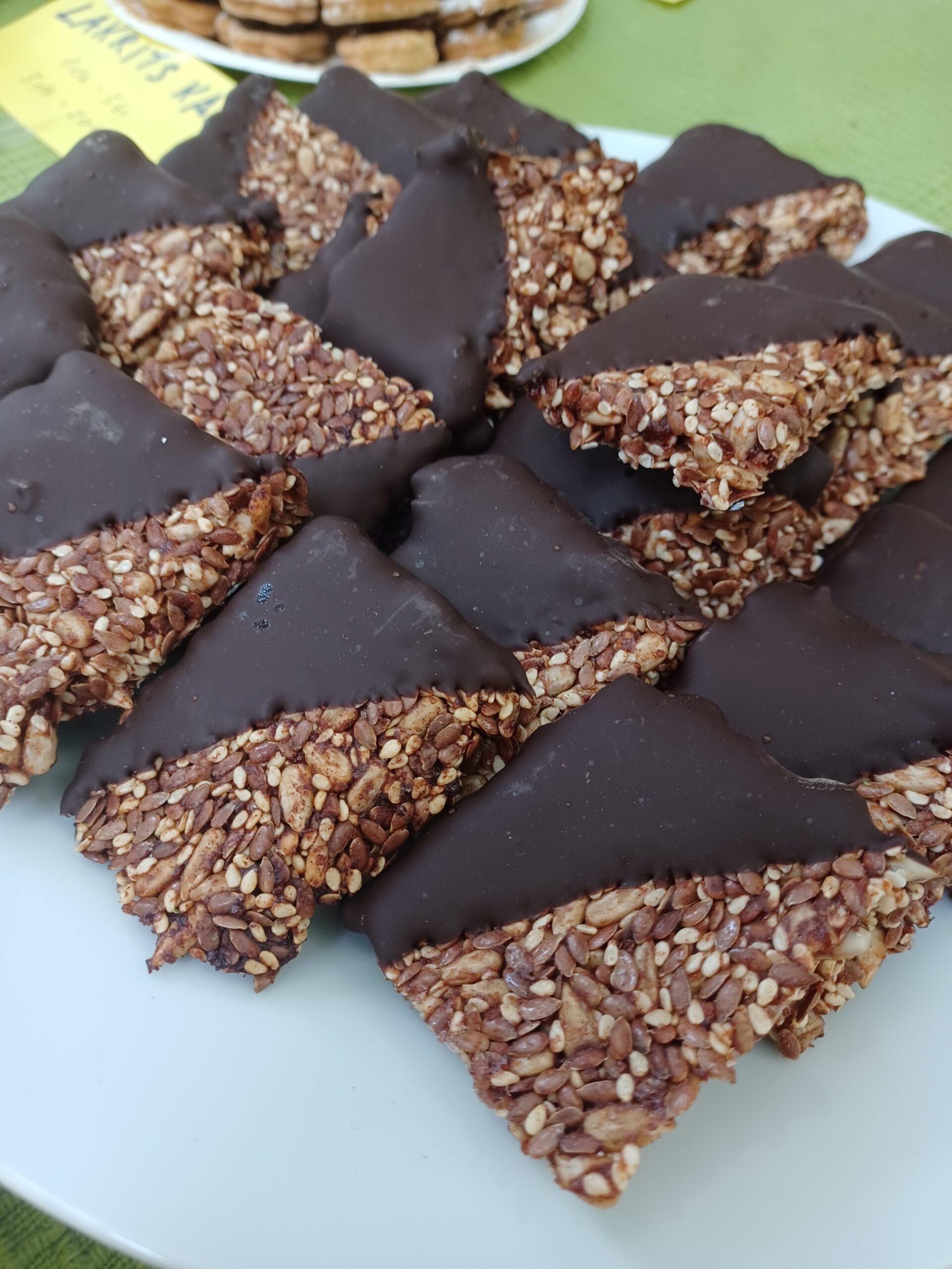 Dessa hantverksmässiga snacks är inte bara förslappade, utan också fantastiska! Noggrant utvalda linfrön, sesamfrön, solrosfrön, mandel och söta dadlar möts i en liten chokladgrotta för att dyka upp därifrån, gnistrande vackert. Varje tugga doppas individuellt i choklad för hand – eftersom vi inte arbetar med maskiner, utan med hjärtan! 💕