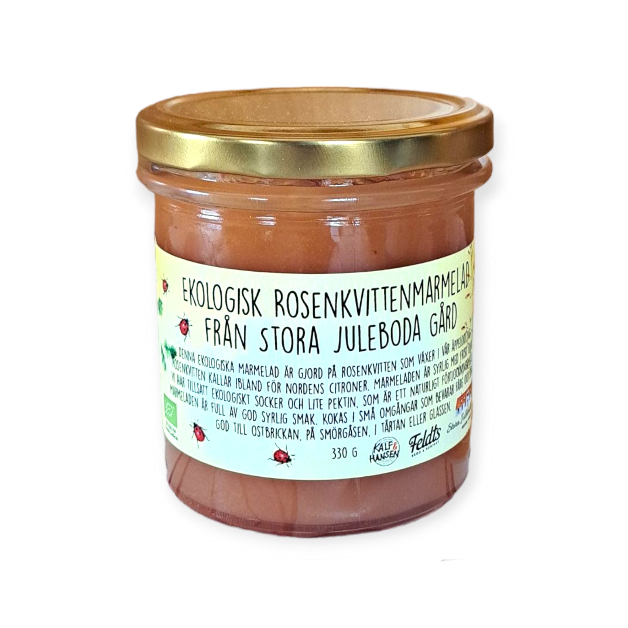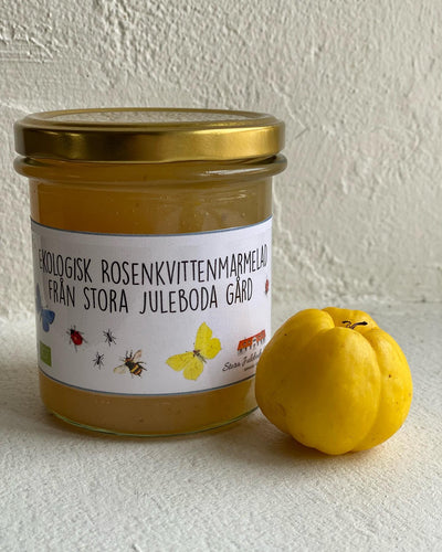 Våra rosenkvittenbuskar växer i vår äppelodling, där de växer sida vid sida med våra äppelträd. Syrlig marmelad med unik smak från rosenkvitten. En klar favorit hos våra kunder.