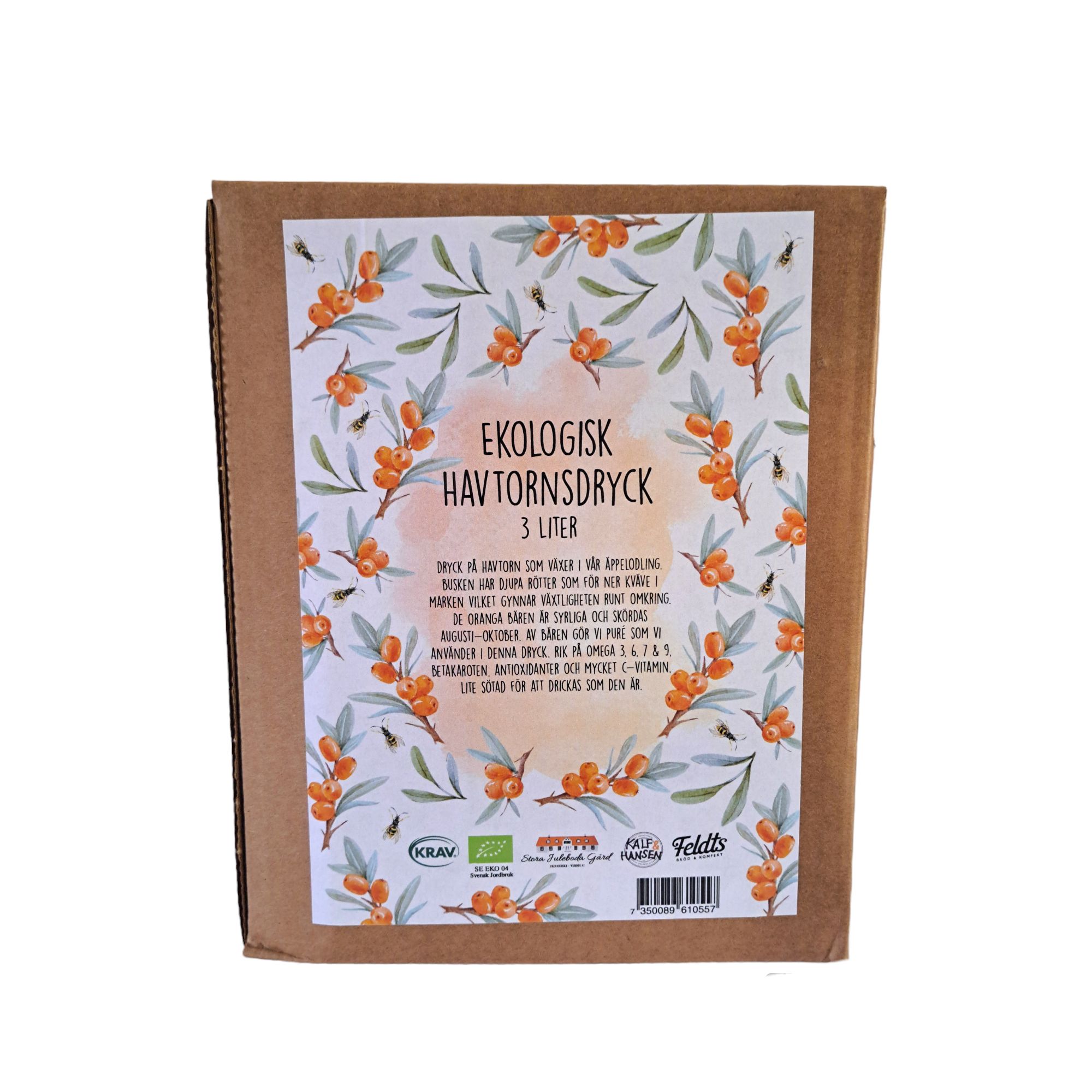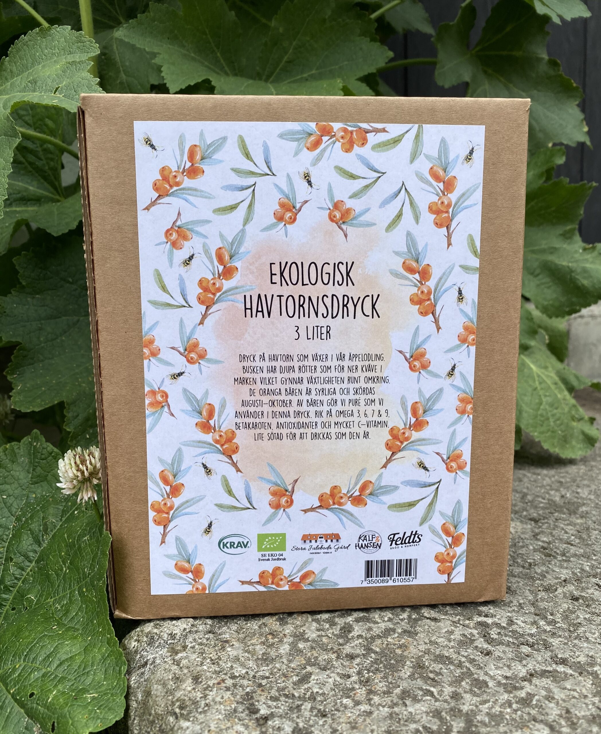 Havtornsdryck gjord på våra havtorn som växer i sida vid sida med våra äppelträd. Havtorn är fulla av ci-vitamin och nyttiga oljor. Syrlig dryck sötad och passar bra till frukost eller som drinktillbehör.