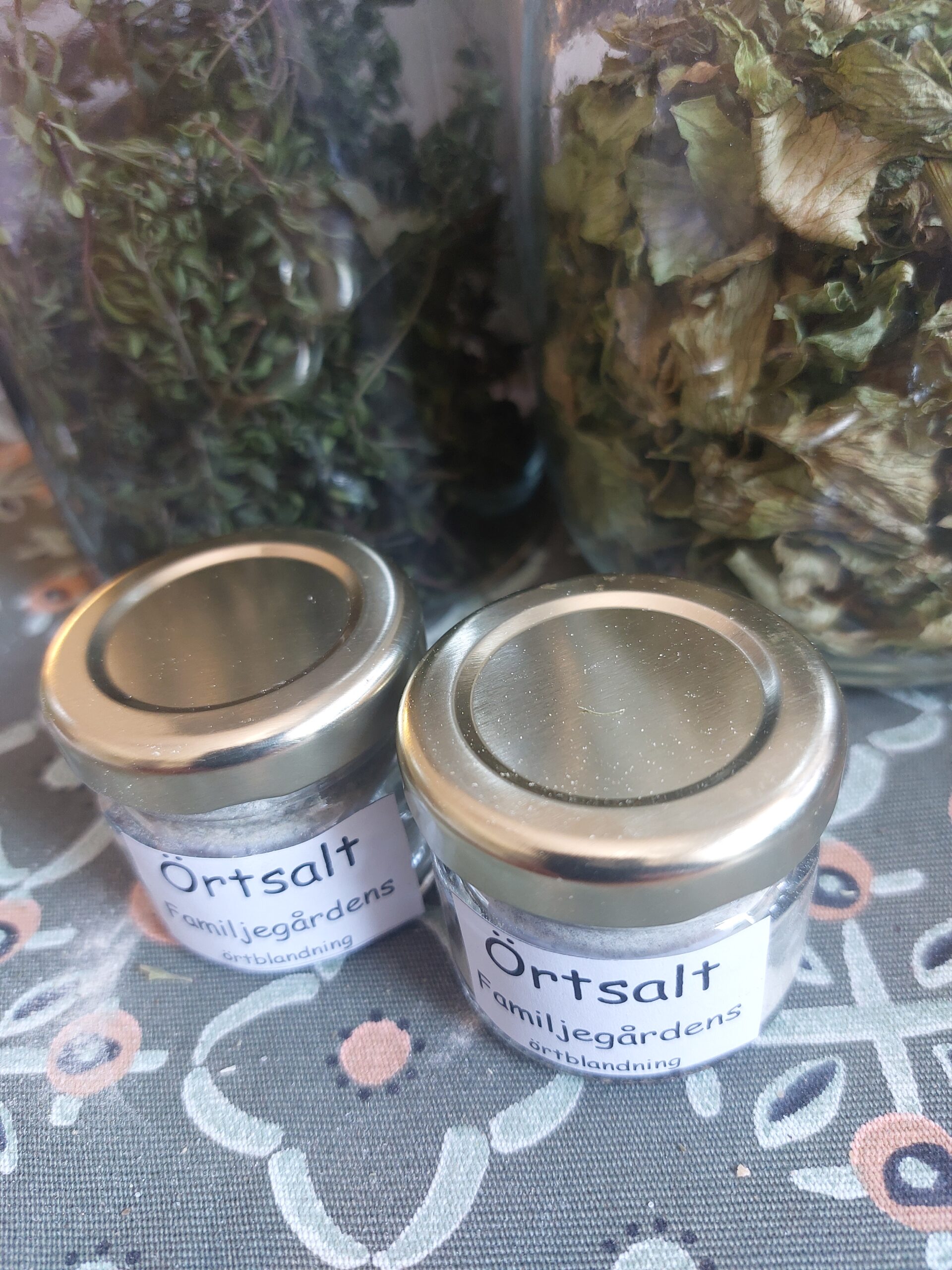 Familjegårdens örtblandning består av salt, libsticka, vitlök, kyndel, rosmarin, timjan