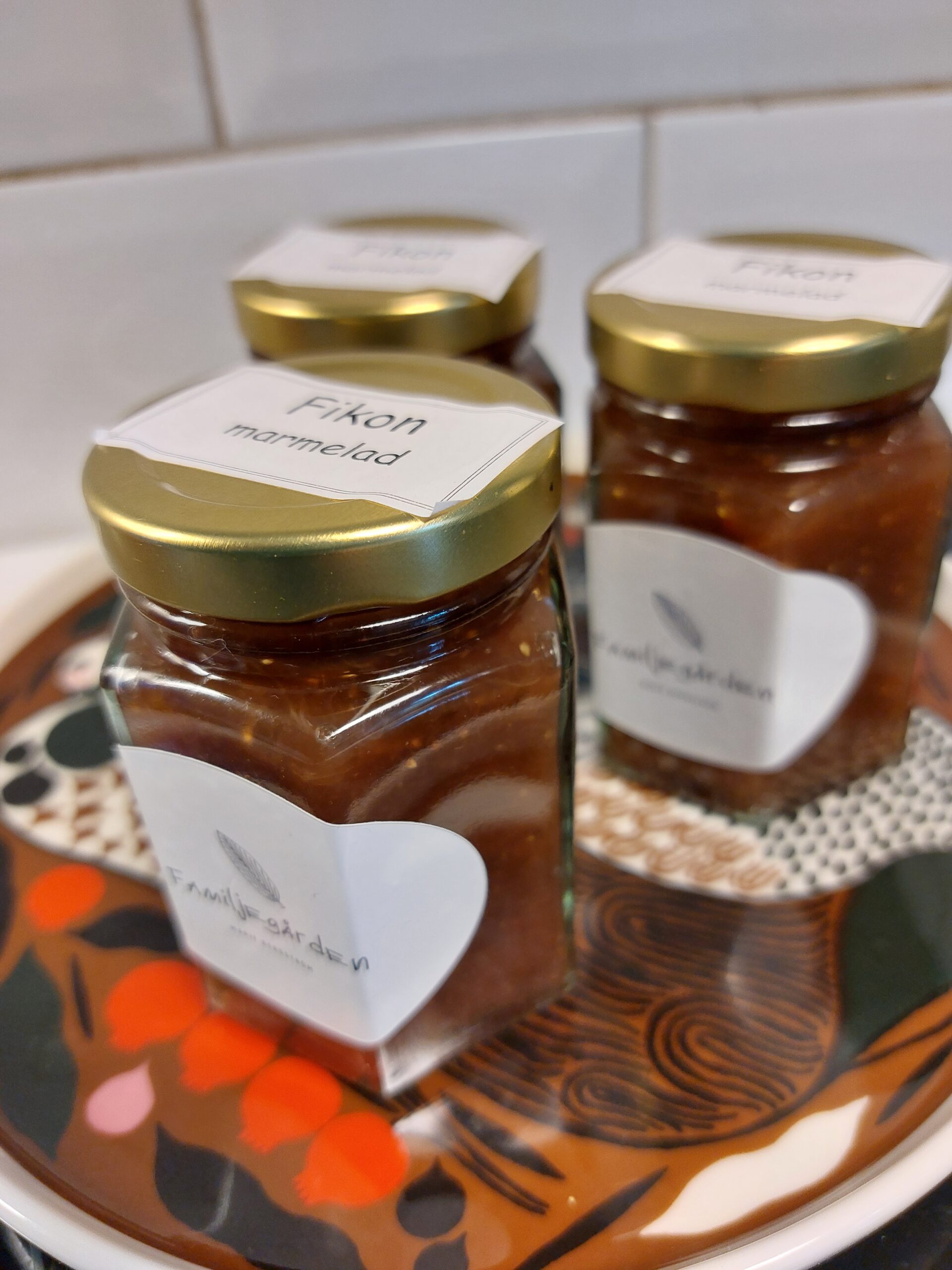 Fikonmarmelad kokt med syltsocker och en nypa chili. Fikonen är lokalproducerade och odlas i växthus av Glashuset i Öslöv. De är helt obesprutade och odlas utan konstgödsel