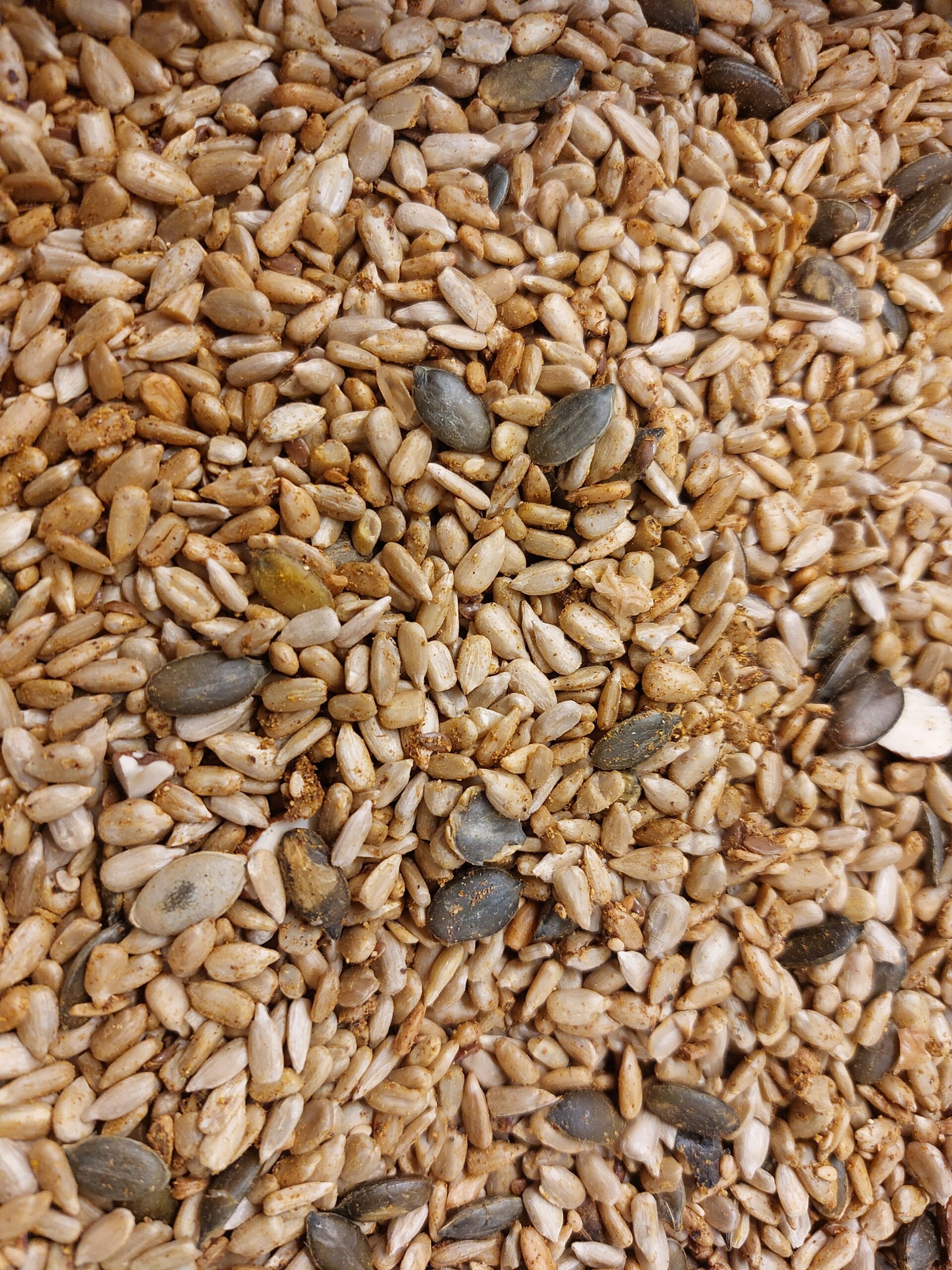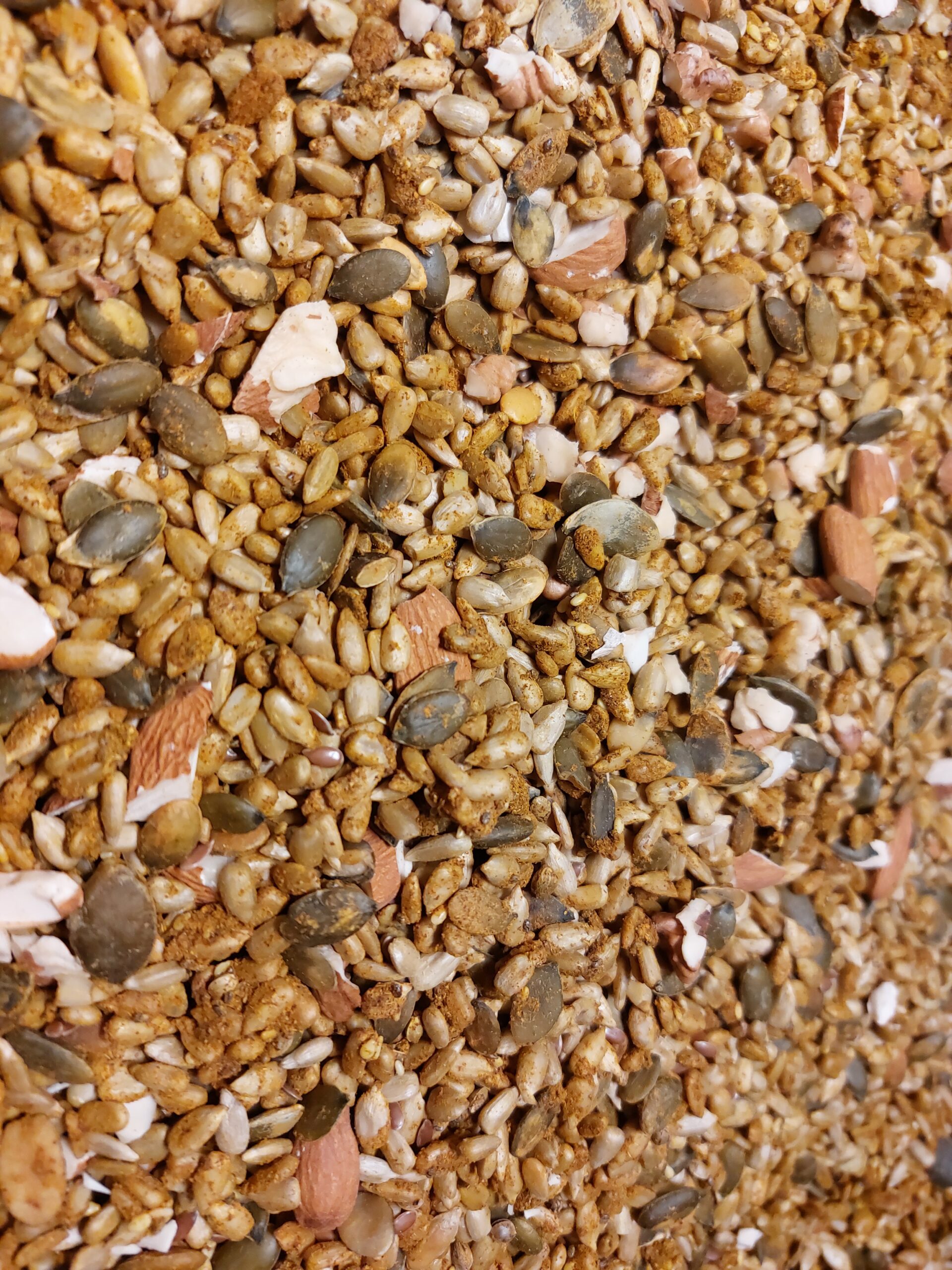 Granola med låg kolhydrathalt är osötad och tillverkas utan olja. Ingredienser: solrosfrö pumpakärnor linfrö sesamfrö nypon gurkmeja kanel ingefära kardemumma vatten