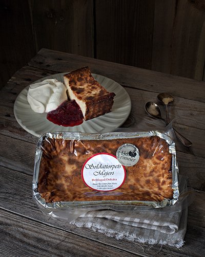 Vår egen ostkaka, gjord på färsk mjölk, ekologiska ägg efter ett gammalt småländskt recept. Glutenfri.