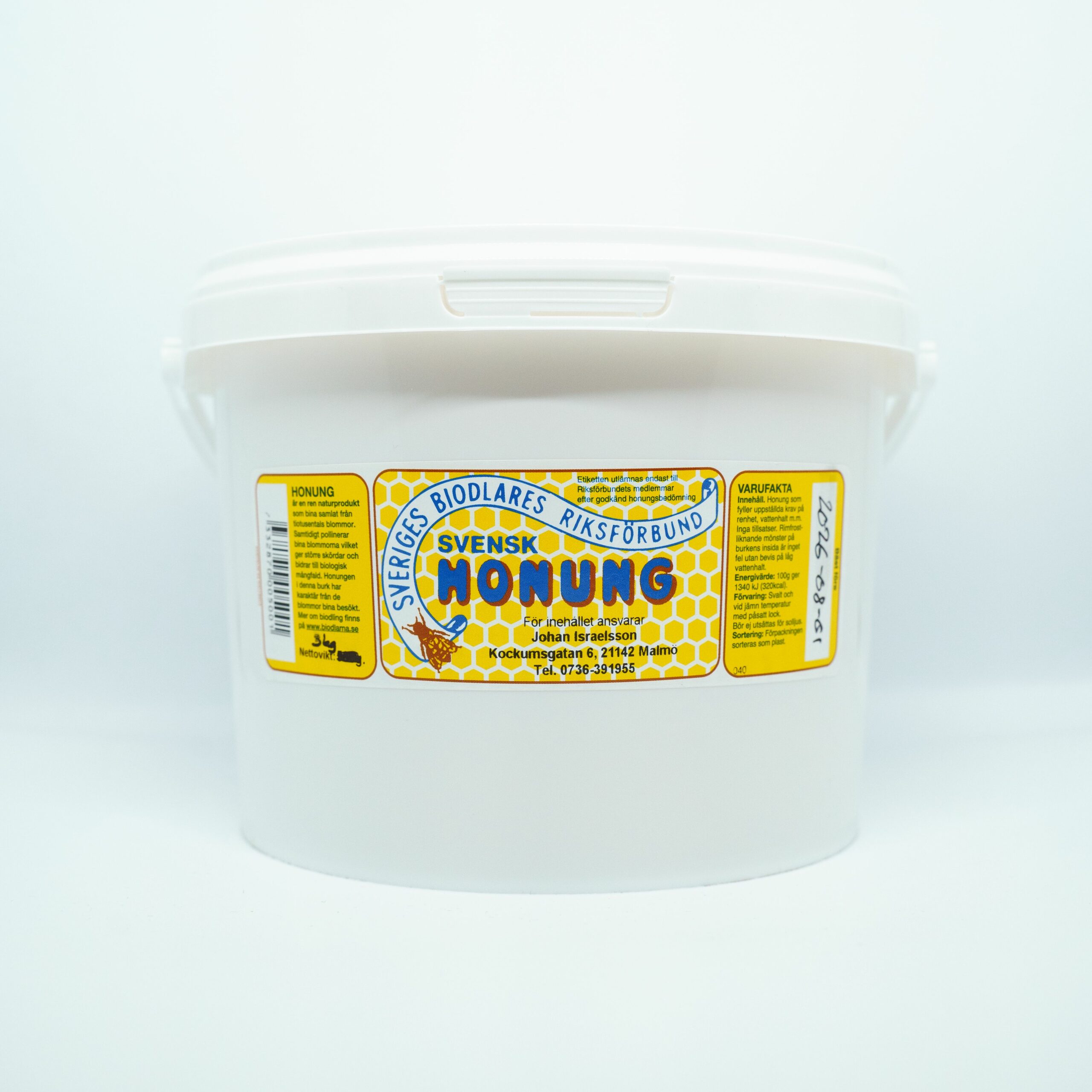 Honung från egna bigårdar i Malmö och på Österlen. Honungen i denna 3 kg-förpackning är tillverkad med minsta möjliga hantering och bearbetning för att bibehålla smak och arom samt alla nyttiga egenskaper.