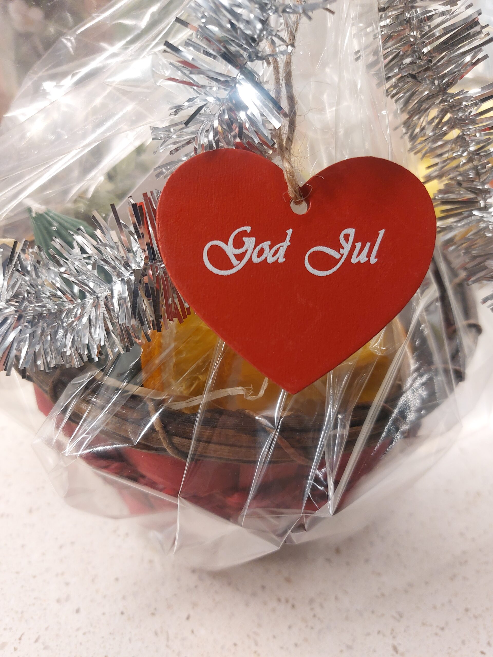 I korgen finns bl.a. marmelader i olika storlekar, örtsalt, mindre påsar granola och örtte och saffransskorpor