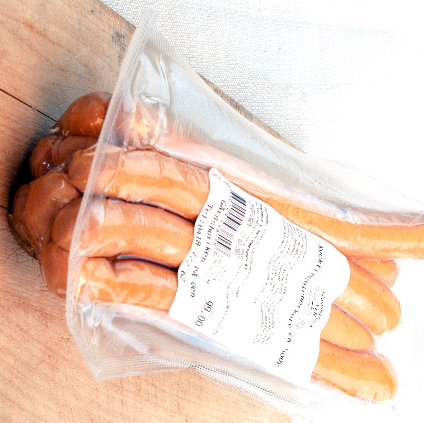 Ingredienser: KYCKLING & SKINN 88% (Naturfjälster svin), Kryddblandning (vitpeppar, lökpulver, ingefära och muskot), Potatismjöl, Nitritsalt (CE250), Socker, Dragon, Oregano.