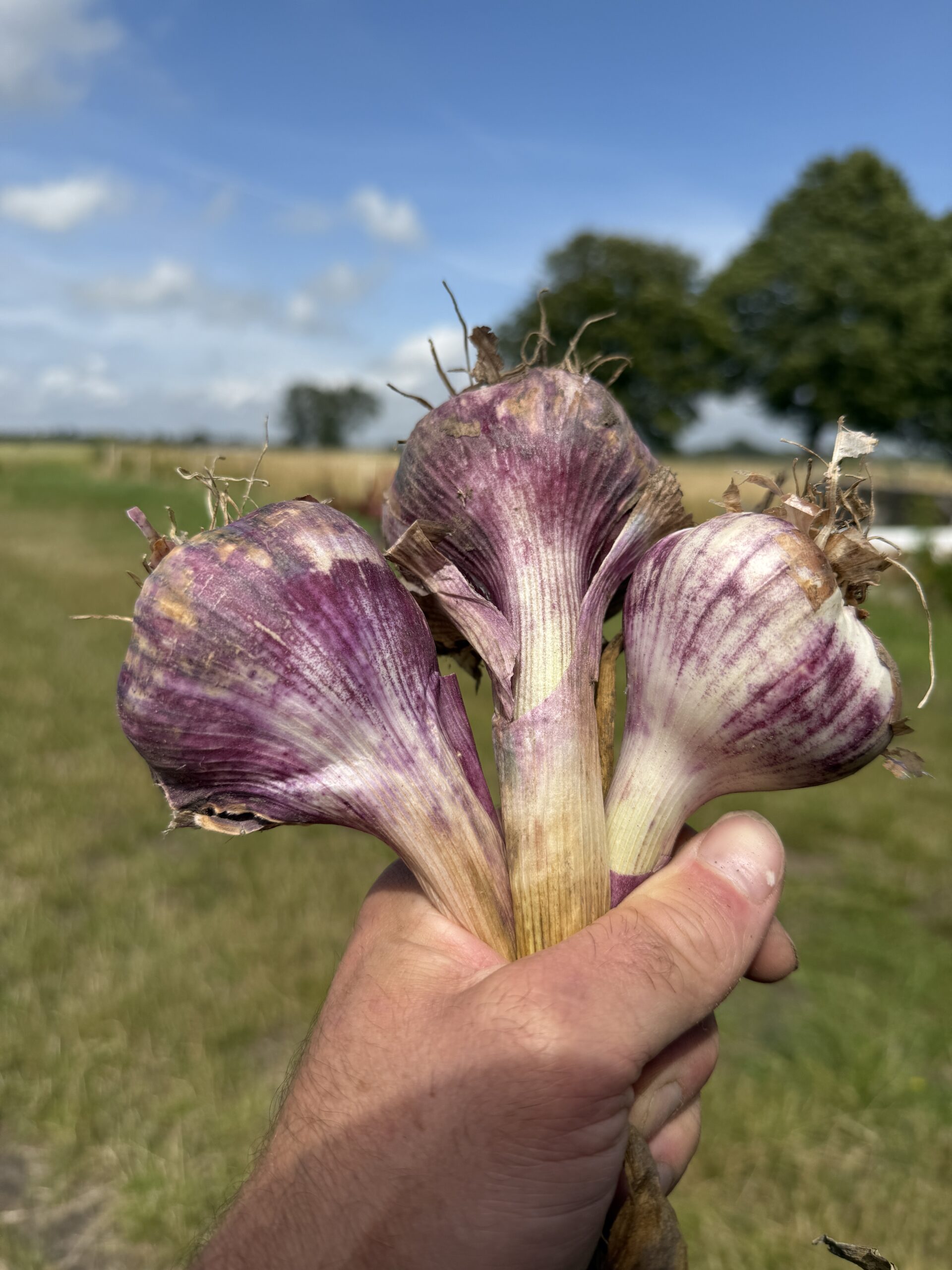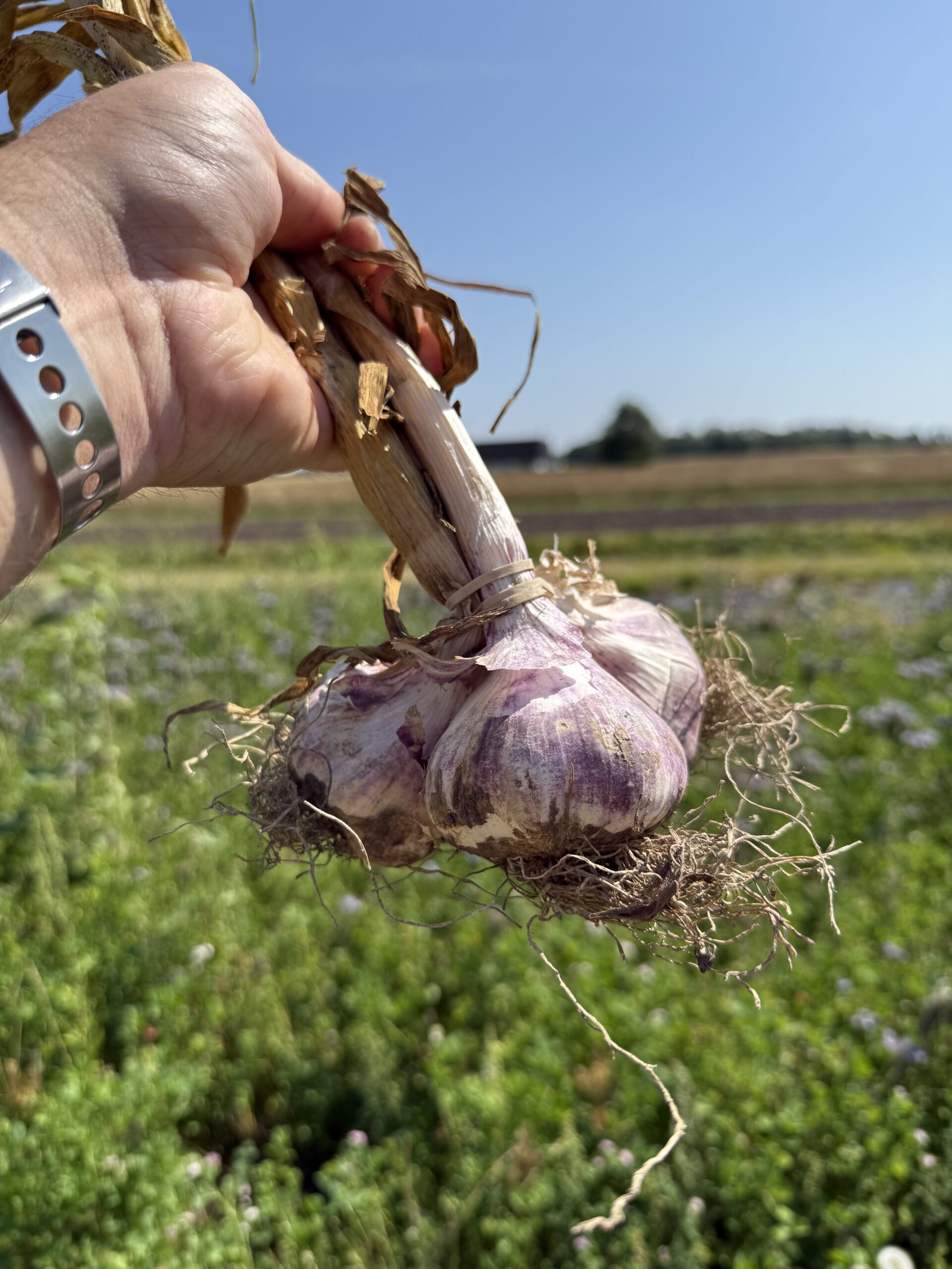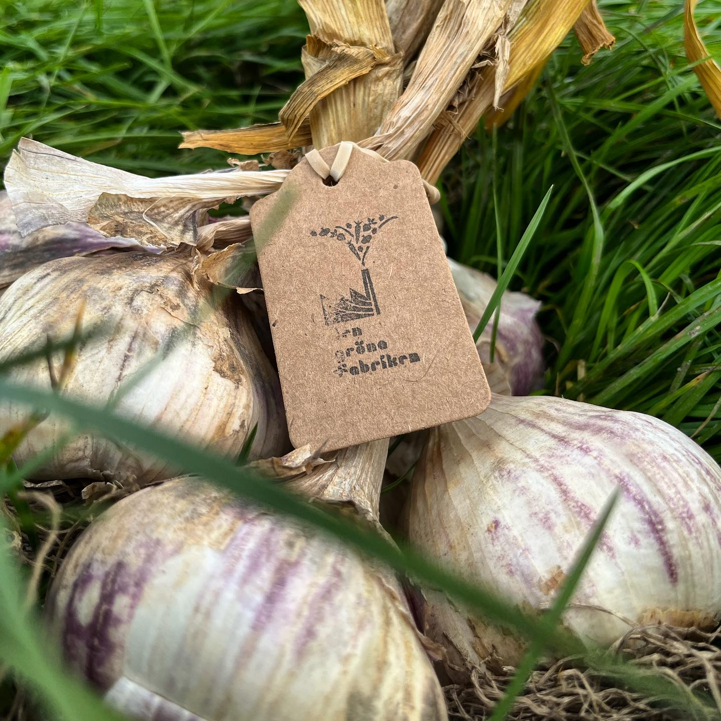 En liten vitlöksbunt med tre rejäla vitlökar eller 4 lökar i standardstorlek av sorten Therador.