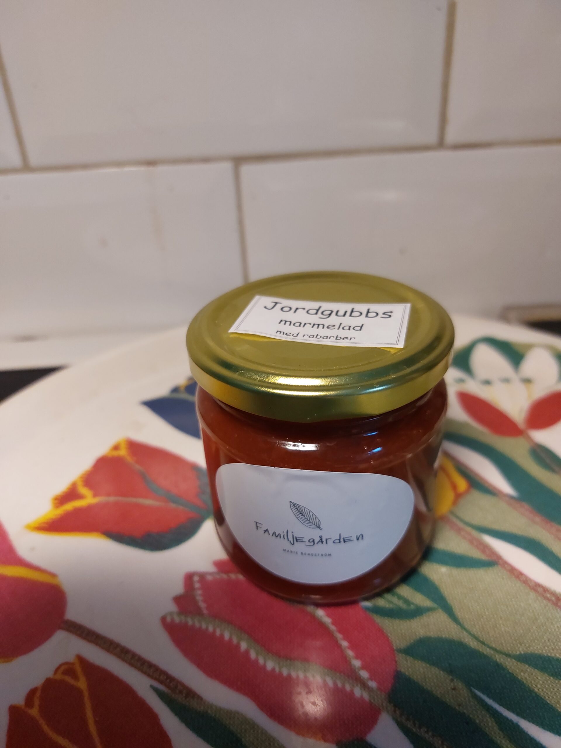 Marmelad med lika delar jordgubbar och rabarber. Kokt på vanligt socker och ekologiskt pektin