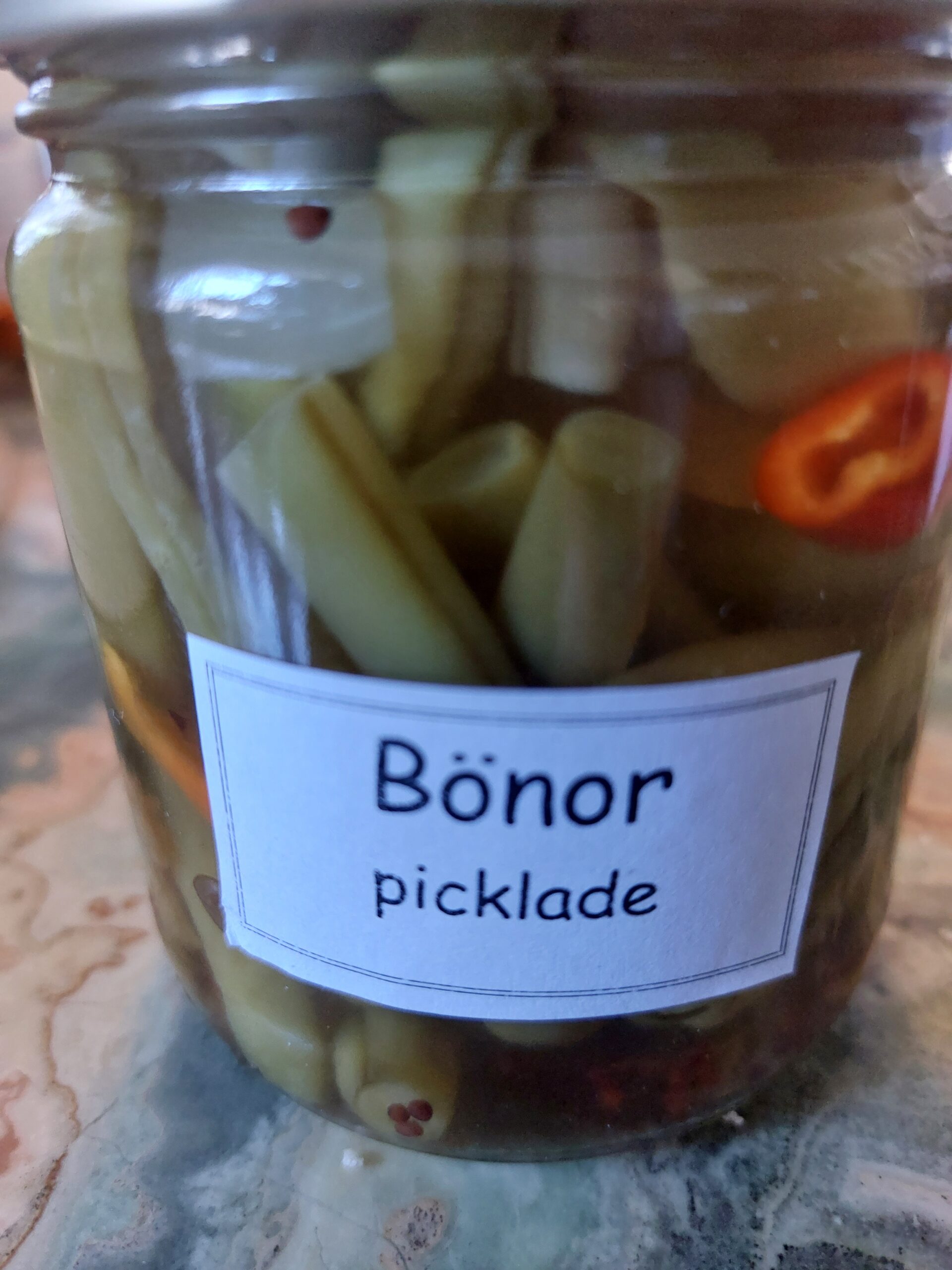 Gröna bönor picklade med lök och chili i en kokt lag av ättika socker vatten. Salt och peppar och senapsfrön är tillsatta