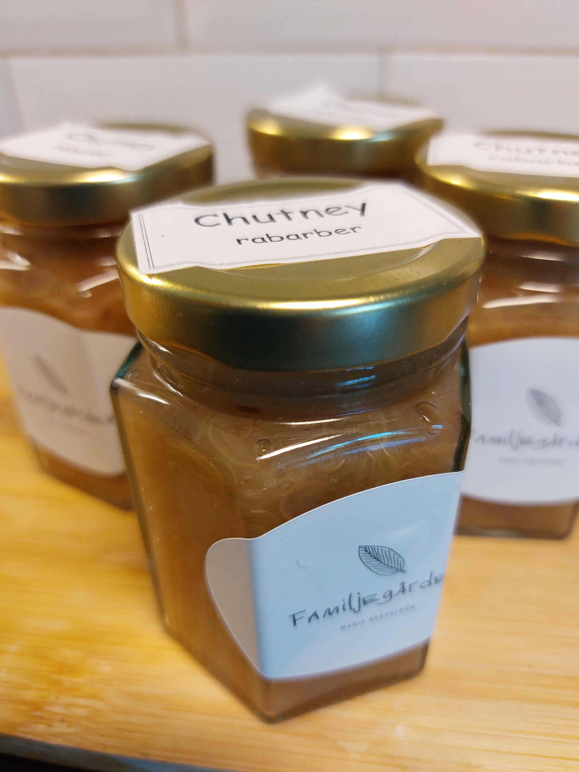 Chutney med rabarber som bas tillsammans med lök vitlök chili ingefära socker och äppelcidervinäger