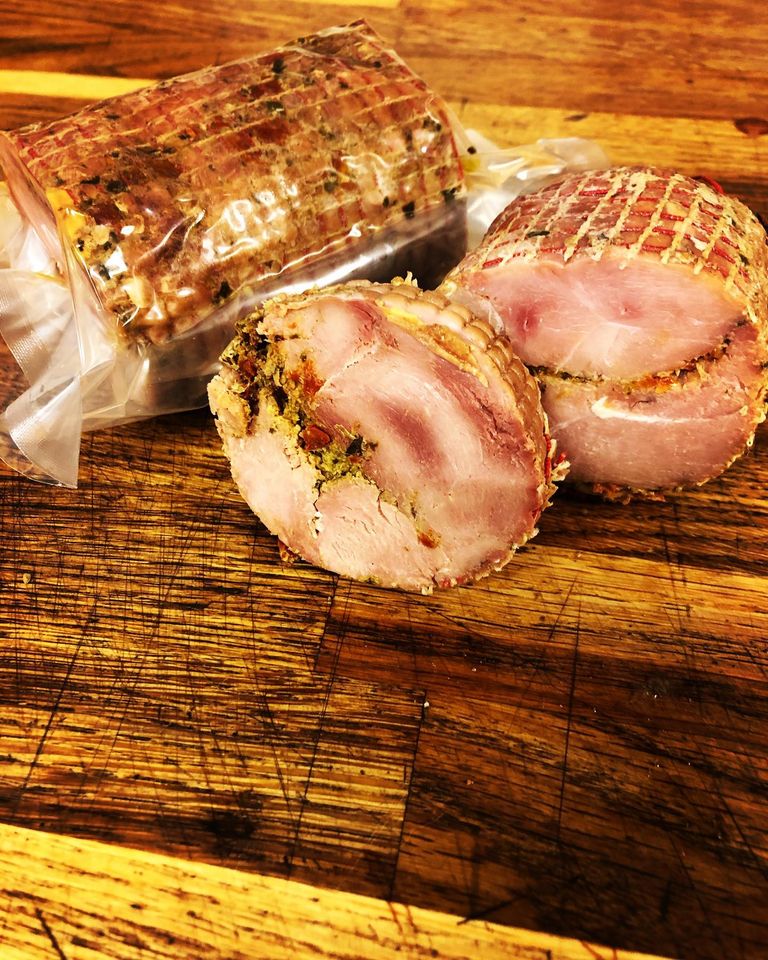 Fasanbröst packade i nät med Pesto och Soltorkade tomater mellan, sedan körda i sousvide.