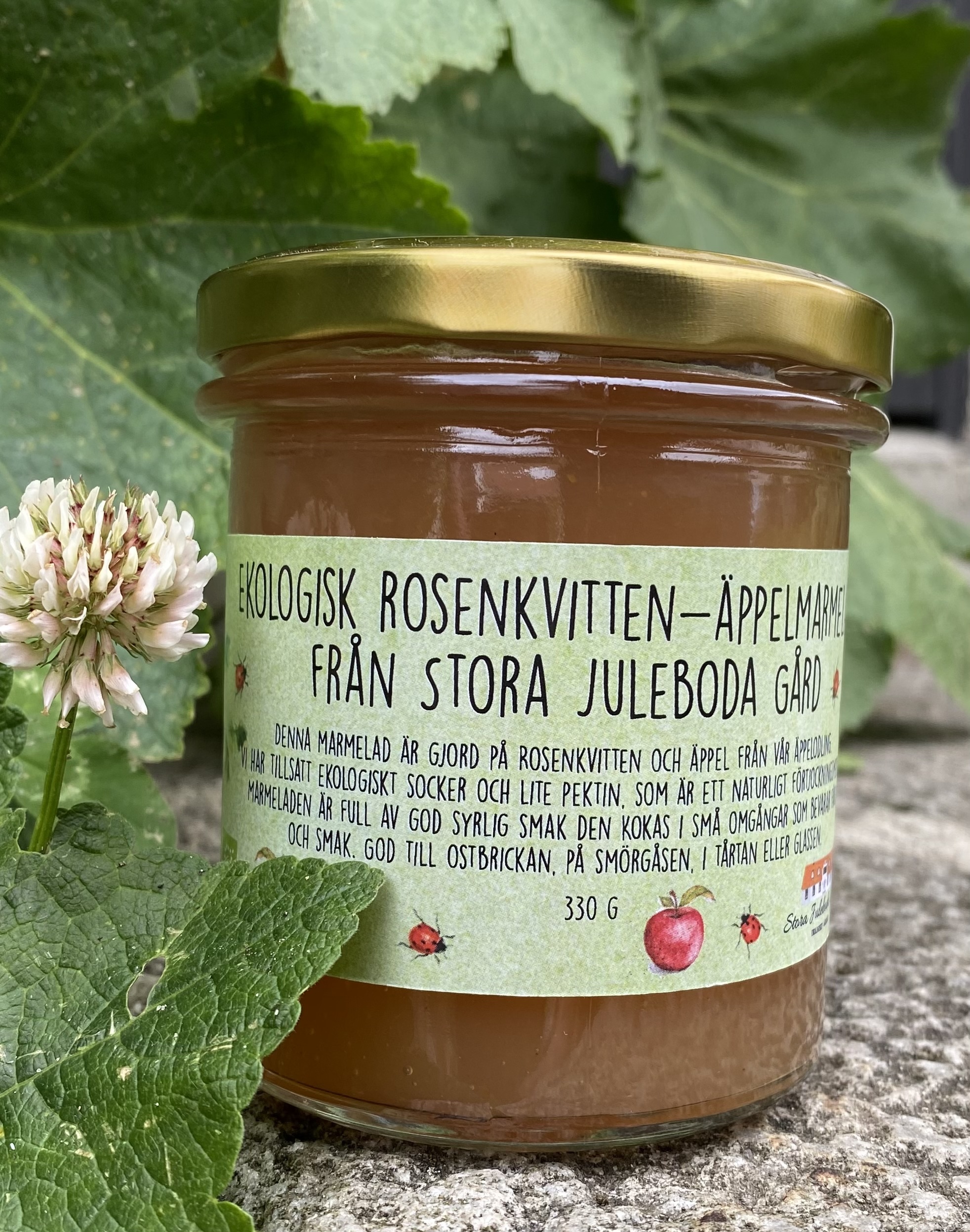 Vår goda marmelad gjord av rosenkvitten och äpple. Rosenkvittens syra möter äpplets sötma en underbar kombo. Kokt i små omgångar, sötad med ekologiskt socker. God på smörgåsen, i kakor eller till glassen.
