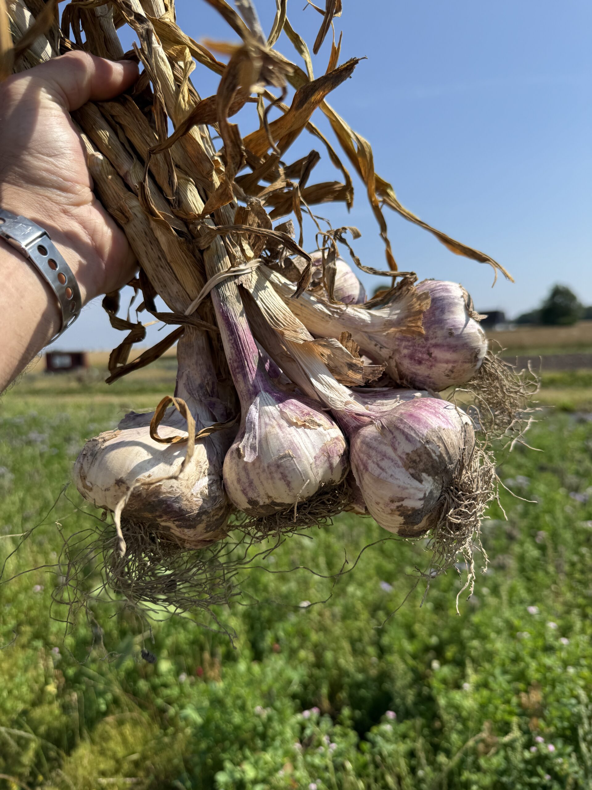 Stor vitlöksbunt med 10 rejäla lökar av sorten Saba Gold.