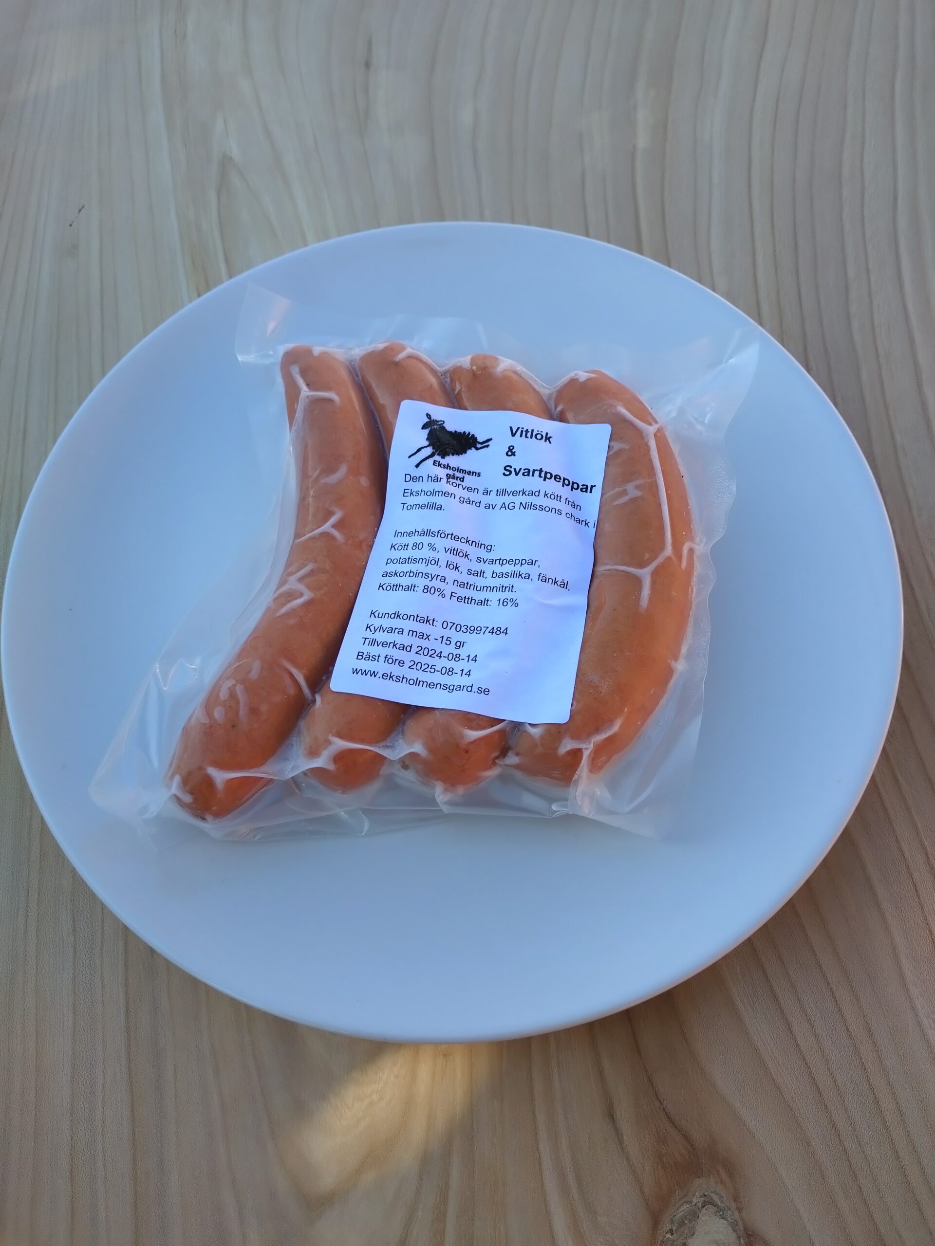 Färskött 85%, fläsk, vatten, potatismjöl, lök, salt, vitlök, svartpeppar, askorbinsyra, natriumnitrit