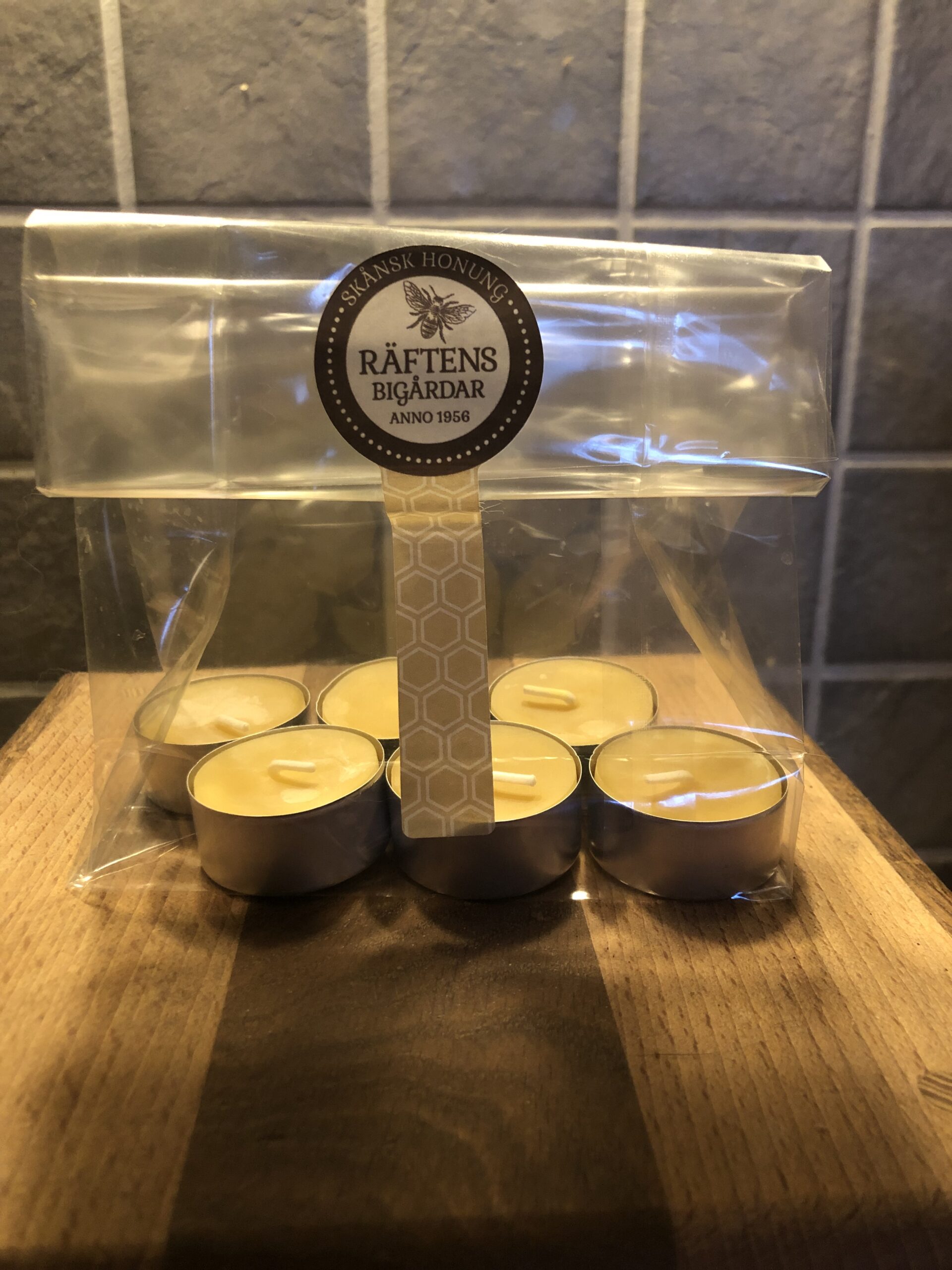 Handgjorda värmeljus av äkta vax, brinner med en fin låga och sprider en doft av vax och honung.
