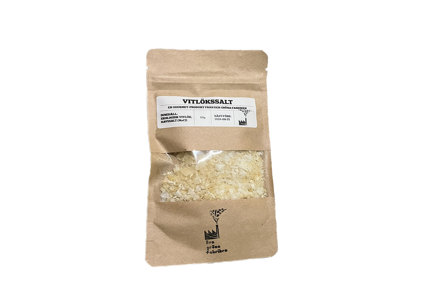 Vårt eget vitlökssalt. Torkad och grovmald vitlök blandat med flingsalt.