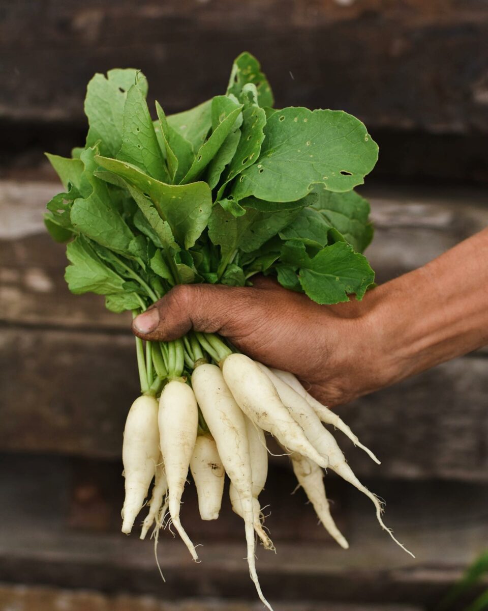 Skär bort de blasten från rädisorna. Skär i halvor.